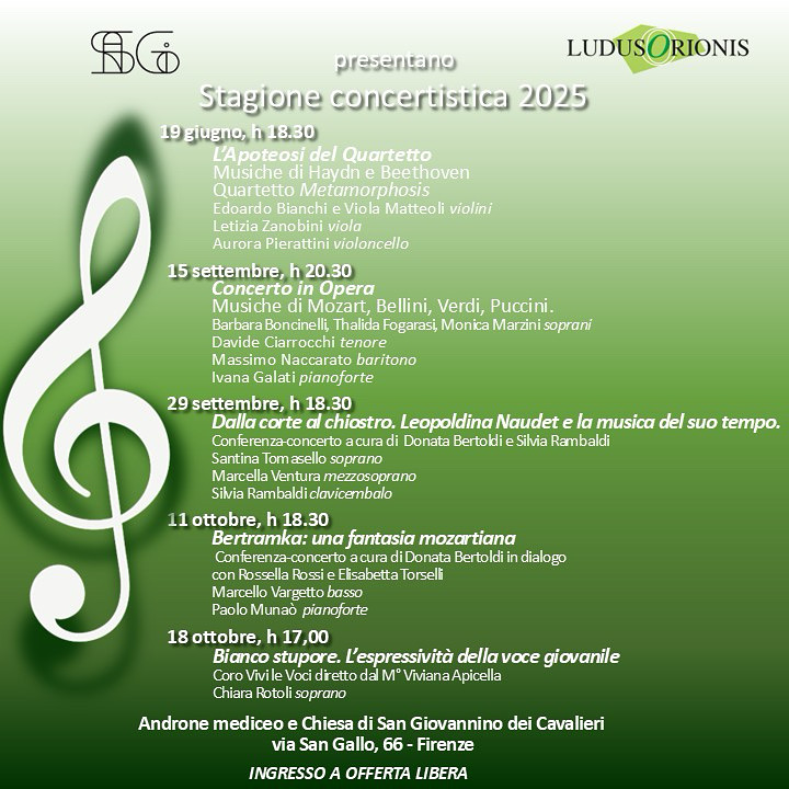 L'Associazione Ludus Orionis, al quinto anno di attività, presenta quattro appuntamenti per i mesi di settembre e ottobre 2025, seconda parte di una stagione che ha visto il concerto del Quartetto Metamorphosis (19 giugno), e il qualificatissimo IV Stage sulla musica sacra in Sicilia nei secoli XVI e XVII tenuto dal M.° Paolo Da Col, seguito da due straordinari concerti (8 e 10 agosto).